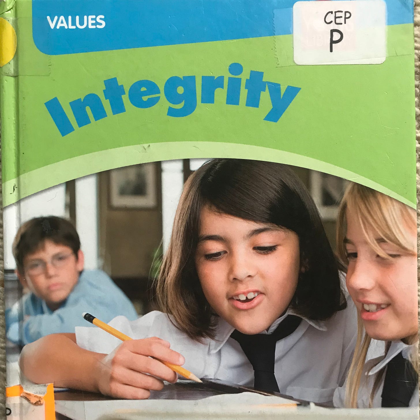 書籍シリーズ”Values"という中の一冊らしく、他タイトルを眺めてみると、それがどのくらい一般的な言葉なのか感覚的にわかった。他には "Fairness" "Helpfulness" "Responsibility" "Honesty" "Kindness" "Respect" "Tolerance".... といったタイトルが並んでいる。公平性、思いやり、責任、正直さ、優しさ、敬意、寛容さ... そして、「インテグリティ」。